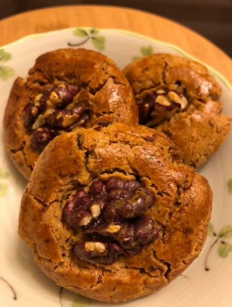 5.分成每個約30g的小糰、揉圓、壓成厚度1.5cm的小圓餅,並壓入一顆裝飾用的核桃。
