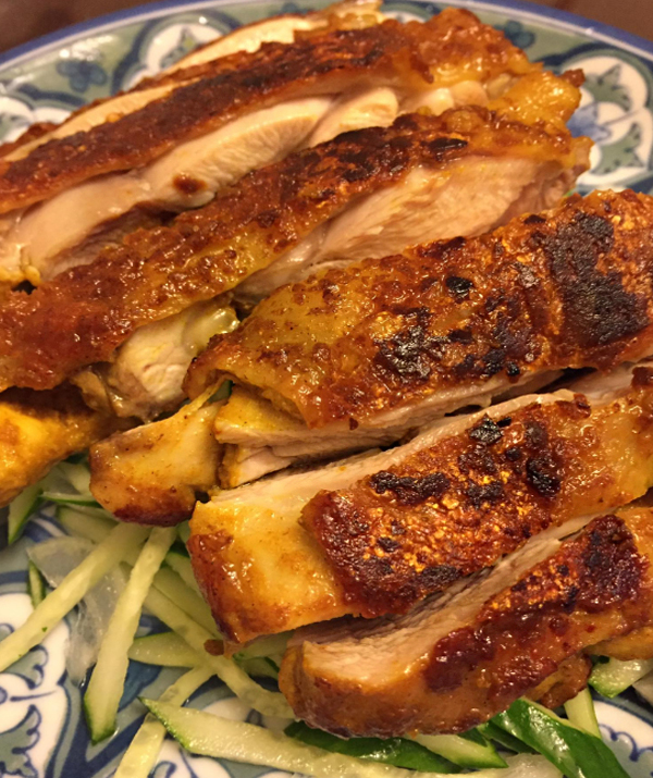 3.用平底鍋、不放油、從雞皮朝下開始煎,初時用中火煎到兩面黃,續用小火蓋鍋蓋煎5分鐘,熄火後掀鍋蓋雞腿放在鍋裡續熱5分鐘,待肉質鬆弛,再切片。