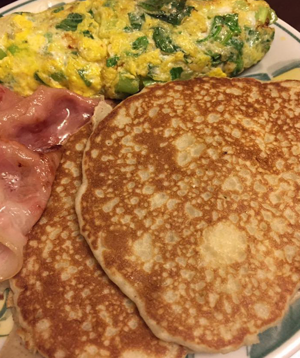 3. 平底鍋加熱,不放油,舀一匙鬆餅糊下鍋,等到冒出氣泡後再翻面,烤到金黃色即可。